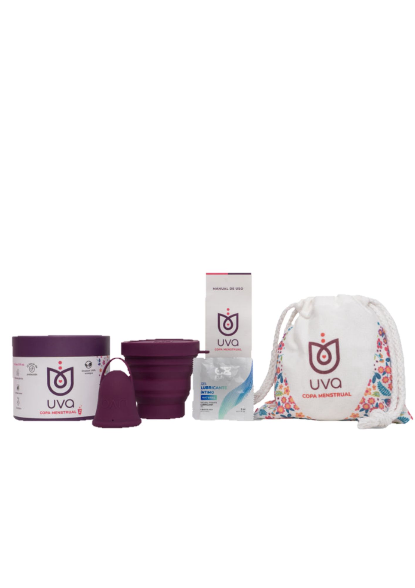 •1 Copa menstrual UVA 2 •1 Esterilizador plegable. •1 Bolsa UVA de algodón. •1 Manual de uso. •1 Sachet 5 ml lubricante íntimo Elixir •1 Empaque 100% ecológico. Silicona grado médico ultra suave al tacto, certificada por el FDA. Hay varias tallas: A: Longitud: 6 cm •Diámetro: 4, 4 cm •Capacidad: 25 ml (0.85 oZ) SIN HIJOS. B: Longitud: 5, 8 cm •Diámetro: 4 cm •Capacidad: 20ml (0.7 oZ) CON HIJOS